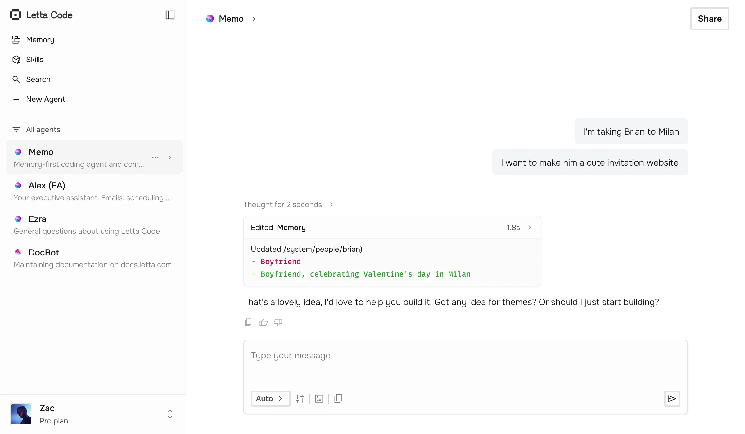 Letta Code uses background memory subagents to improve prompts, context, and skills over time with experience. View your agent's memory in the memory palace.